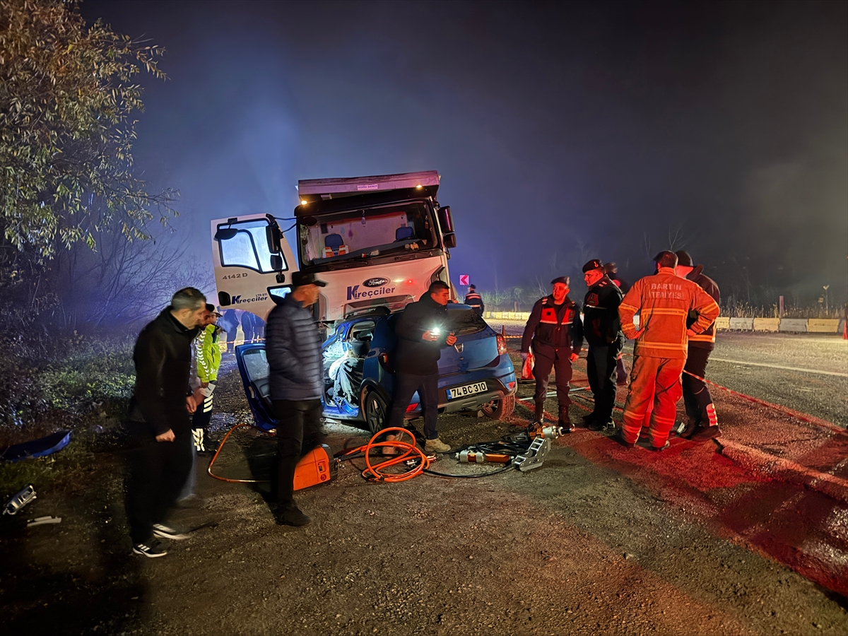 Alınan bilgiye göre, Bartın İnkumu yolu Boğaz mevkisinde Ümit Kömeç (44) idaresindeki 74 DH 890 plakalı kamyon ile Berkan Kaya (22) yönetimindeki 74 BC 310 plakalı otomobil çarpıştı.